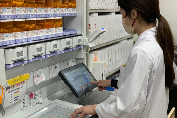 処方箋受付システムの立ち上げ、薬棚や在庫の確認、当日の処方傾向をチェックします。 -